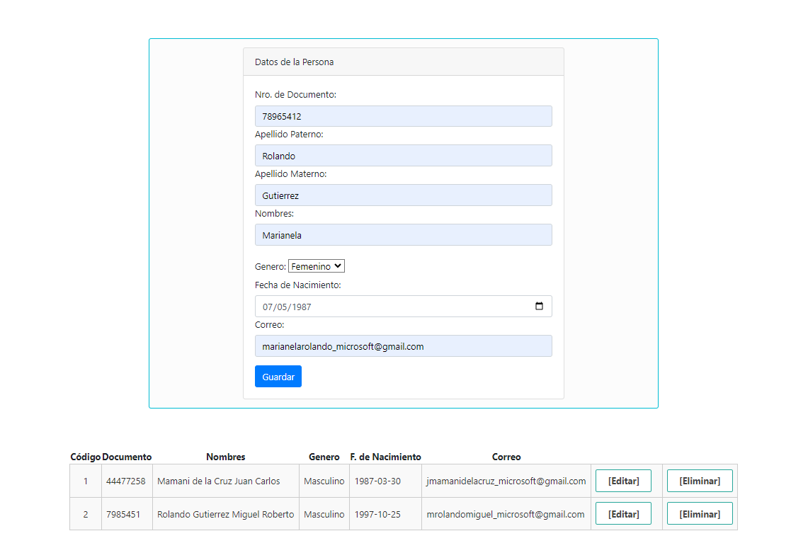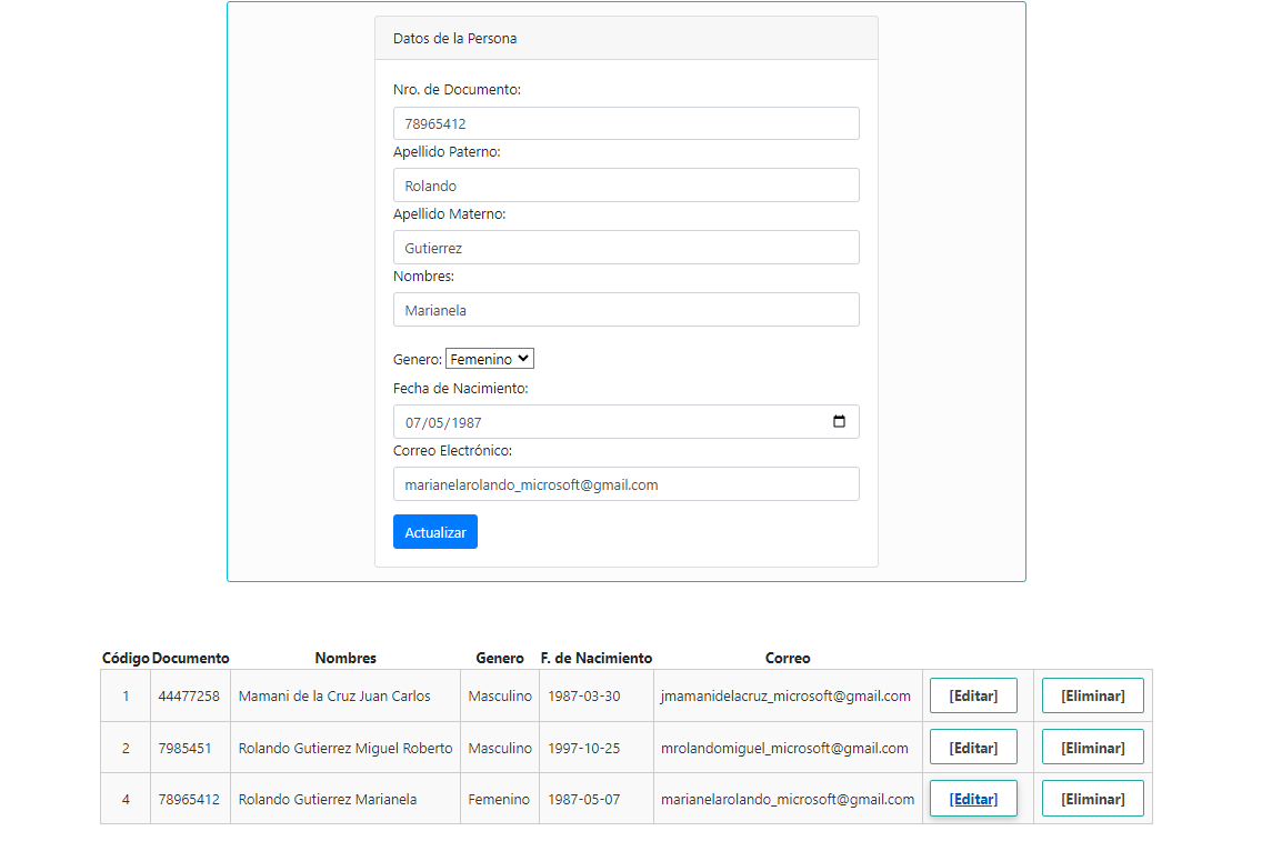 Captura de actualización de un registro