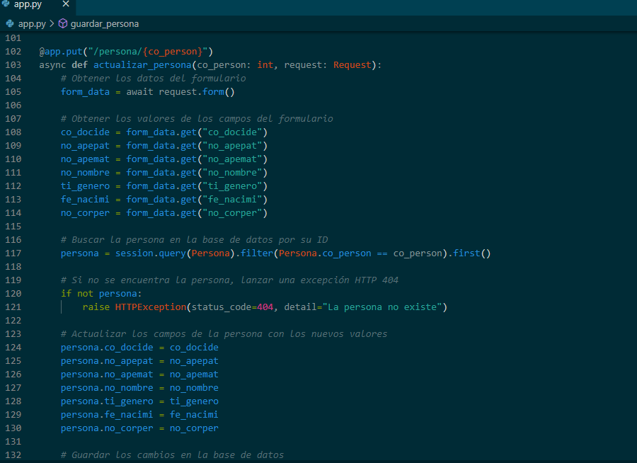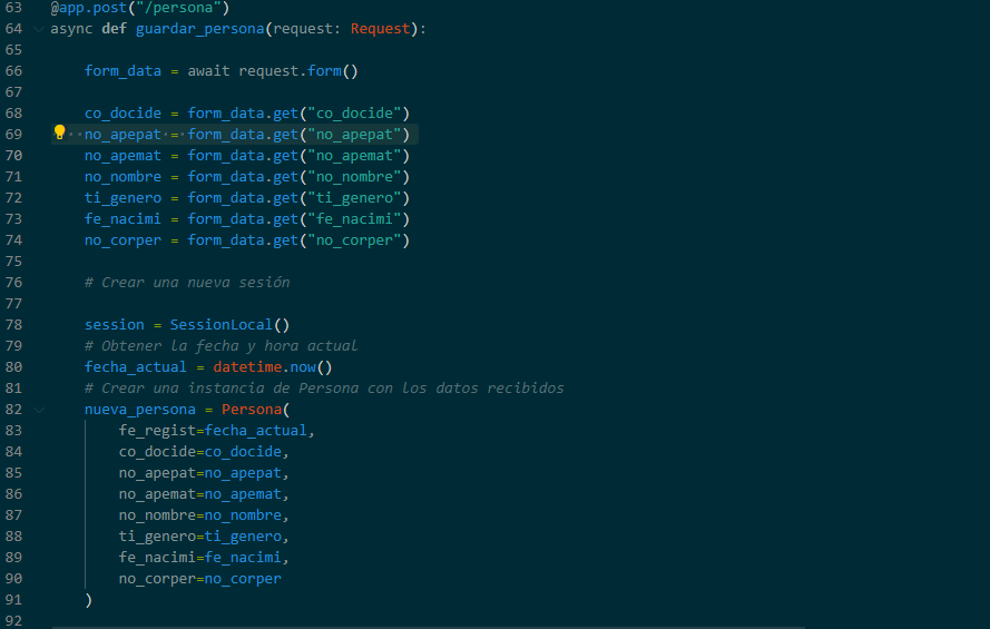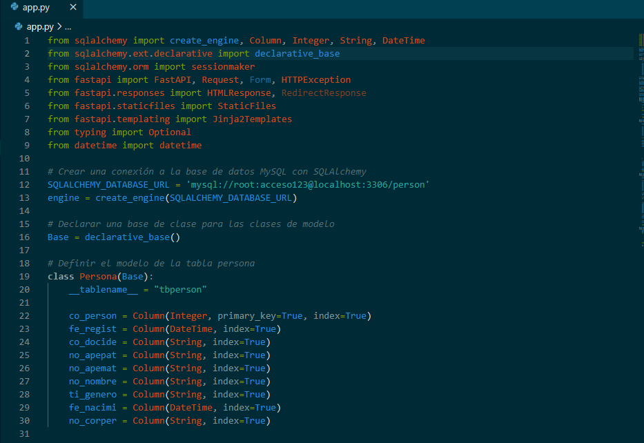 1.- Clonar el Repositorio: Clona este repositorio en tu máquina local utilizando el siguiente comando: git clone https://github.com/ jcarlosmamanidelacruz/ Apis-con-fastapi-python.git 2.- Configurar la Base de Datos: - Abre tu cliente de MySQL u otro cliente SQL de tu elección. - Utiliza el cliente para cargar el script script.sql y crear las tablas en la base de datos. Puedes abrir el archivo en el cliente y ejecutarlo directamente. - Una vez creadas la tabla, carga el archivo querys.sql en tu cliente SQL para agregar datos a la base de datos. 3.- Activar el Entorno Virtual: Activa el entorno virtual del proyecto utilizando el siguiente comando: source venv/bin/activate 4.- Instalar Dependencias: Instala las dependencias del proyecto desde el archivo requirements.txt utilizando el siguiente comando: pip install -r requirements.txt 5.- Ejecutar la Aplicación: Ejecuta el archivo app.py para iniciar la aplicación FastAPI. Utiliza el siguiente comando: uvicorn app:app --reload