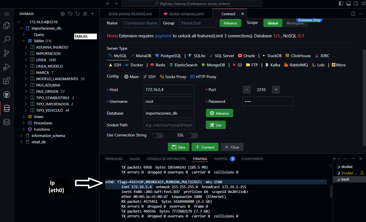 Este contenedor contiene una base de datos llamada importaciones_db y consta de las tablas que se verá en al imagen.