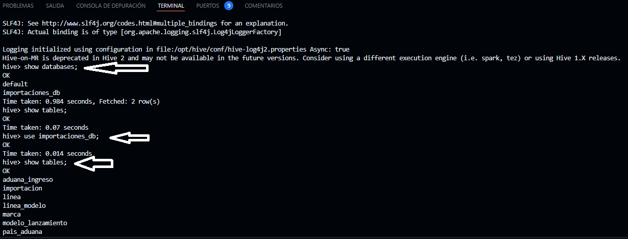 - En el terminal de hive-server luego de haber ejecutado el comando hive ejecutamos lo siguiente