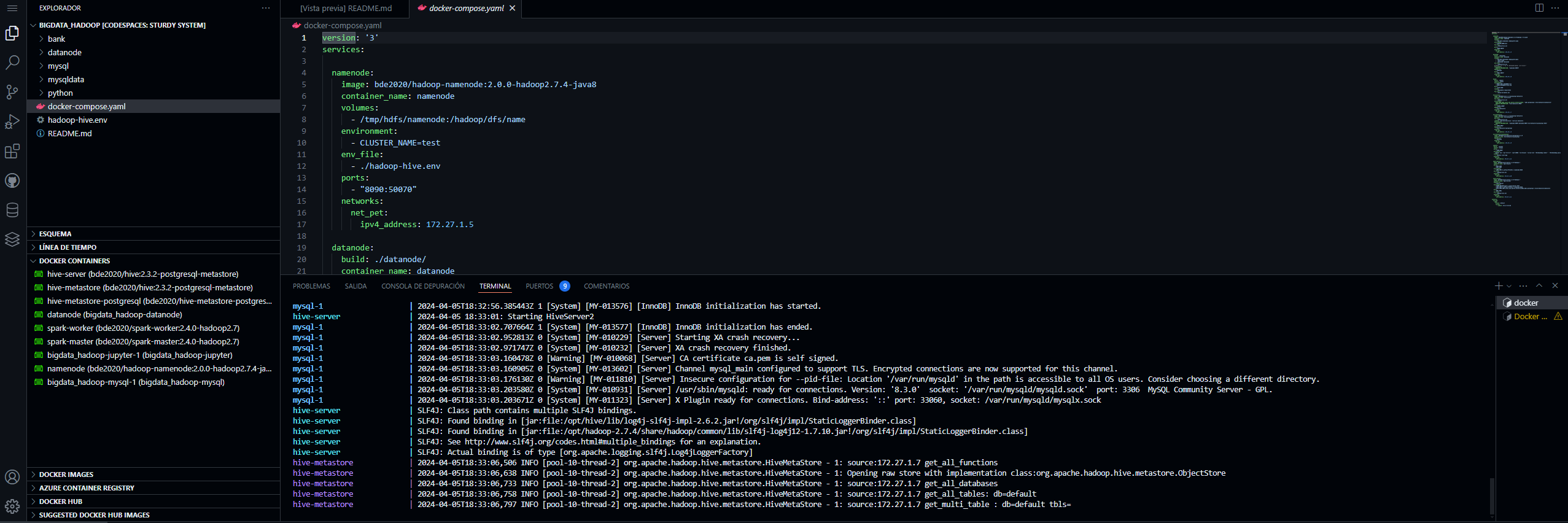 Esta linea desplegara los contenedores y podras ver estos utilizando la extension Docker explorer