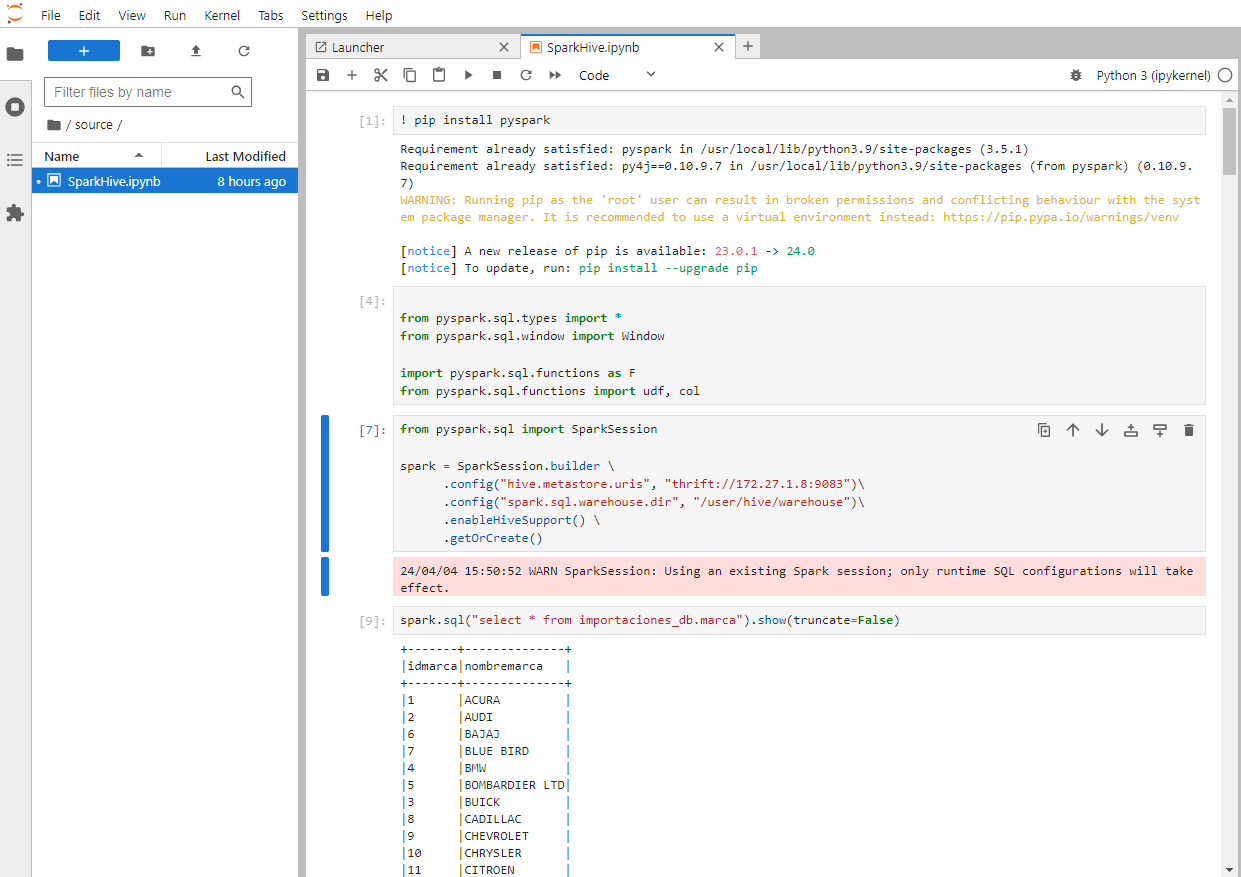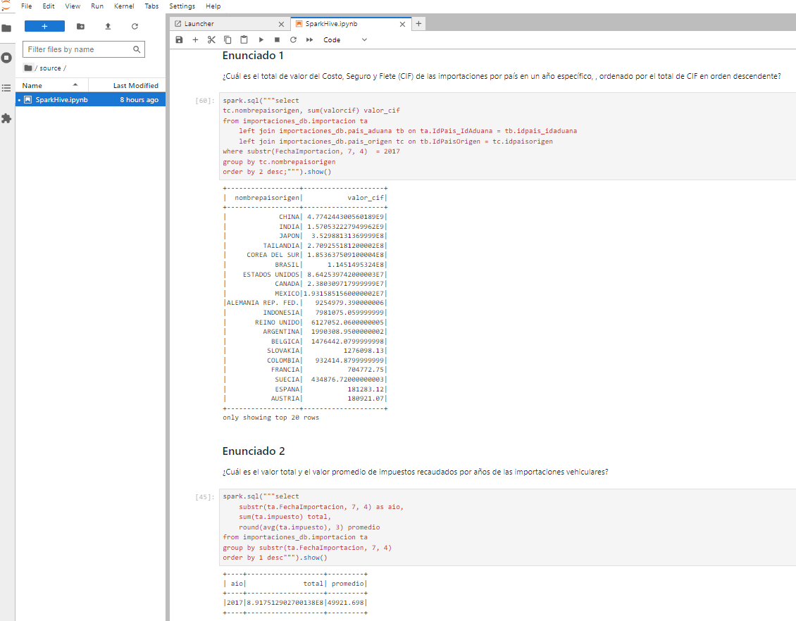 Para trabajar con las tablas migradas de importaciones_db en Hadoop, utilizaremos Spark. A continuación, se detallan los pasos para conectarte a Hive y realizar análisis de datos utilizando PySpark desde Jupyter Notebook:
