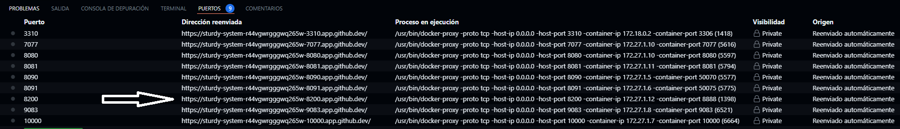 Una vez que los contenedores estén en funcionamiento, puedes utilizar Docker Explorer en Visual Studio Code para acceder a los puertos expuestos por los contenedores acá ubicaremos el puerto 8200 que es el puerto expuesto para nuestro Jupyter Notebook