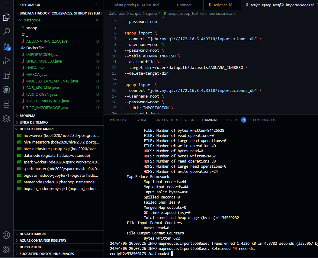 - Para exportar las tablas de la base de datos importaciones_db con sqoop al HDFS de hadoop ejecutar lo siguiente: