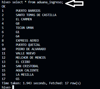 - En la misma terminal de hive-server ejecutamos lo siguiente comando para verificar el contenido de las tablas en hive;
