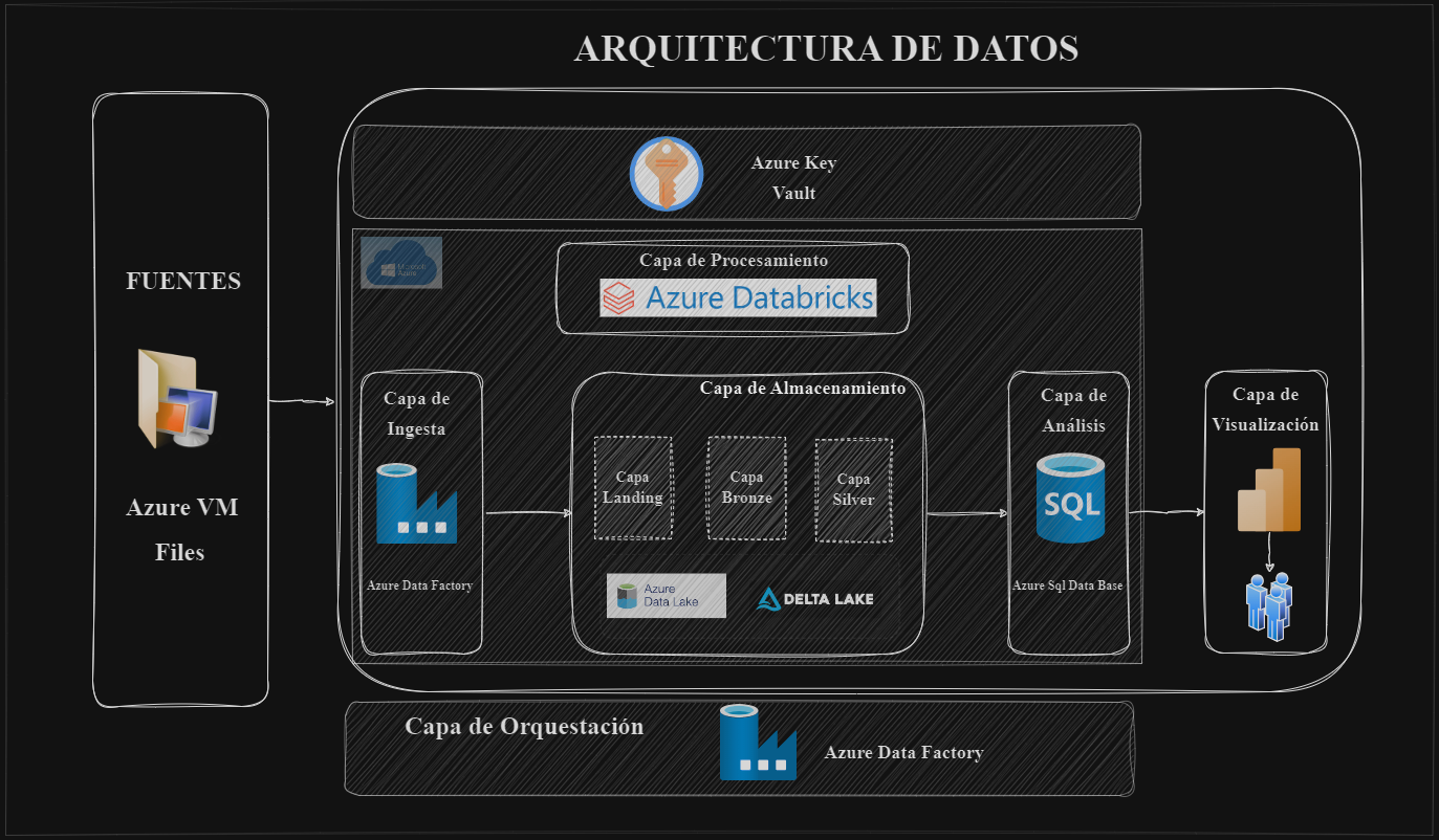 En este proyecto, se ha desplegado una solución completa de análisis de datos utilizando Microsoft Azure. El proceso abarcó la creación y configuración de varios servicios de Azure, incluyendo Azure Synapse Analytics, Azure Data Factory, Azure SQL Database, Azure Key Vault, Azure Databricks, una máquina virtual para simular un entorno local con Integration Runtime, y la integración con Power BI para la visualización de datos.
