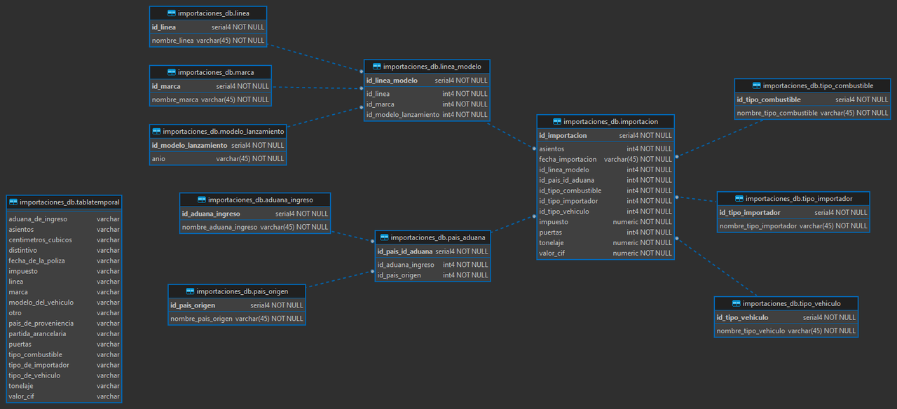 UPPER: Se utiliza para convertir todos los datos a mayúsculas, asegurando así una homologación de la información. TRIM: Se utiliza para eliminar espacios en blanco al inicio y al final de los datos. UPDATE: Se utiliza para realizar una limpieza y actualización de los datos. Por ejemplo, en casos donde se detectó que la marca "GREAT DANE" estaba escrita incorrectamente como "RATE DANE". DELETE: Se utiliza para eliminar la información de las tablas antes de la ejecución del stored procedure, evitando así errores al momento de la población. INSERT INTO: Se utiliza para poblar las tablas con los datos limpios y estructurados. GROUP BY: Se utiliza para agrupar los datos de los catálogos al momento de la carga. ORDER BY: Se utiliza para ordenar los datos al momento de insertarlos, asegurando que las claves automáticas se generen en el orden correcto. LEFT JOIN e INNER JOIN: Se utilizan para poblar tablas que dependen de otras tablas de catálogo previamente pobladas, de manera que se puedan obtener sus llaves primarias. Bucle FOR: Se utiliza para recorrer los registros de la tabla temporal y, en la recursividad, extraer las llaves de cada catálogo para poblar la tabla base que contiene los registros de las importaciones.